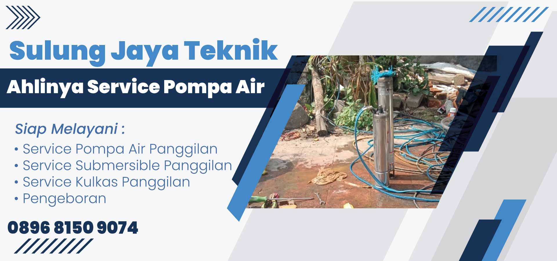 Sulung Jaya Teknik merupakan penyedia jasa service panggilan dan pengeboran di Kota Bandung. Terhitung sudah lebih dari 7 tahun kami melayani masyarakat yang memerlukan jasa service dan pengeboran. Jasa service panggilan kami melayani pompa air, submersible hingga kulkas untuk semua kerusakan, segala tipe dan merk. Kami juga siap melakukan pengeboran untuk kebutuhan akses air bersih anda.